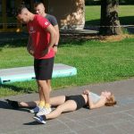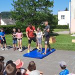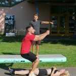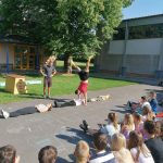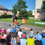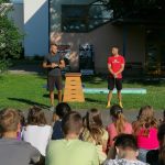 Marek a Martin z teamu StayHero nám nejdříve o parkouru povídali. Například co to je a kdo ho založil. Potom nám podle našich přání některé triky přes překážky ukázali. Nechybělo ani skákání přes dobrovolníky a různá salta. Proběhla i soutěž o náramky – odměna za správné odpovědi na otázky, které zazněly na začátku. Nakonec Martin vybral několik dobrovolníků, kteří si chtěli zkusit nácvik na back flip.