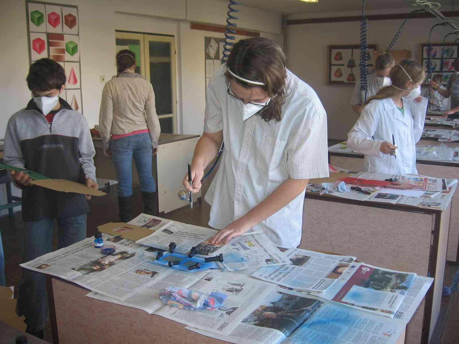 Střední škola uměleckoprůmyslová v Ústí nad Orlicí už podruhé pozvala nás žáky osmé a deváté třídy do svých učeben, abychom se v rámci projektu na podporu přírodovědného a technického vzdělávání a pod dohledem středoškoláků a jejich učitelů zapojily do aktivit pro nás připravených. V průběhu 6 vyučovacích hodin jsme pracovali ve skupinách na stanovištích s různým zaměřením, které jsme si vybírali sami. Dívky si většinou vybrali práci s textilem, vyráběly vánoční ozdoby metodou falešného patchworku a stromeček z lásky, kreslily střihy na sukni a přinesly si i polotovar, který mohou samy dodělat. Další skupina vyráběla v učebně obalové techniky auta z lepenky. Z předkreslené lepenky vyřezali tvar, vyrýhovali a pomocí šablon, vybaveni pracovními oděvy, výrobek nabarvili technikou airbrush. Hotova auta slepili dohromady. Chlapci se seznámili s oborem mechanik – seřizovač a nástrojař. Nejdříve si zkusili na počítači zadat technologické postupy výroby součástek a potom se studenty průmyslové školy pracovali na modelech, kde museli podle schématu zapojit kompresor, aby rozpohybovali písty. Na konci dne byli všichni unaveni, ale určitě spokojeni.