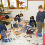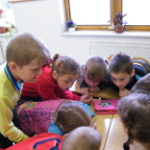 Nejprve bylo potřeba srovnat obrázkovou osnovu, podle které jsme zvládli společně vyprávět Karkulčin příběh. Potom jsme k obrázkům přiřazovali rozstříhaný text pohádky, který jsme opsali, vymalovávali obrázky, našli písmenka pro nadpis v časopisech a novinách a nakonec sestavili knihu. Knihy se nám opravdu povedly.