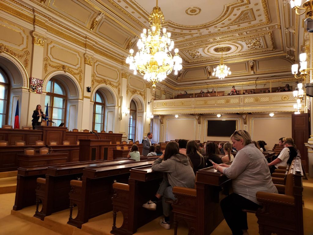 Ve čtvrtek 11.5. jsme se s žáky osmé a deváté třídy zúčastnili exkurze do Poslanecké sněmovny Parlamentu České republiky v Praze. Naše cesta začala již v 6 hodin ráno, všichni se dostavili včas a plni očekávání jsme vyrazili. Po deváté hodině jsme vystoupili v Praze a tramvají dál pokračovali směrem do Poslanecké sněmovny.