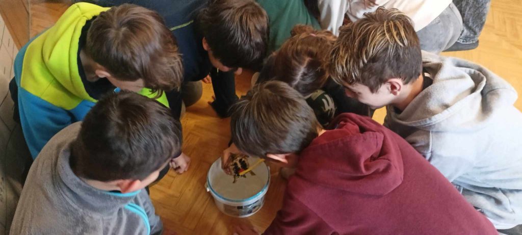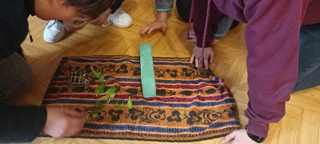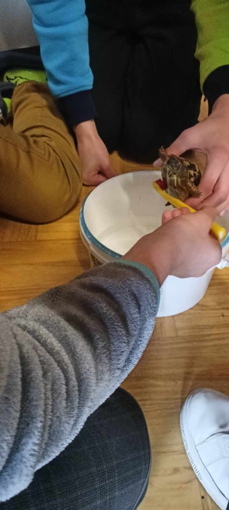 Péči o želvy si žáci 7. třídy vyzkoušeli i prakticky. Společně vykoupali obě želvy a nakrmili je jejich oblíbeným polníčkem. Tento zážitek nejenže prohloubil jejich znalosti o chovu zvířat, ale ukázal, jak důležitá je zodpovědnost při péči o živé tvory.