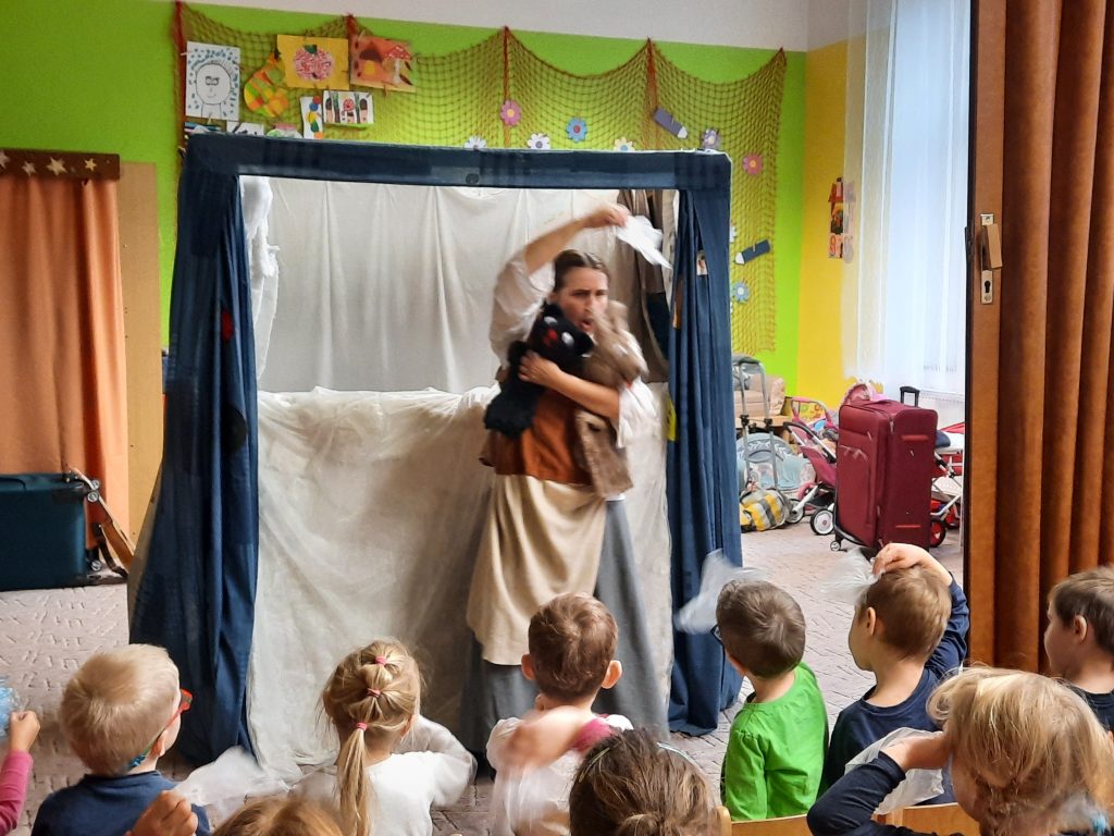 JOJO od školkáčků, JOJO od prvňáčků a divadélko začíná. Tentokrát přijelo s pohádkou skoro předvánoční O dvanácti měsíčkách. A že byla legrace s tímhle divadélkem není pochyb.
