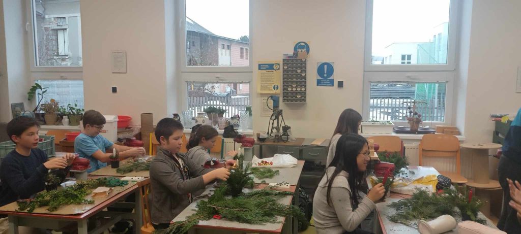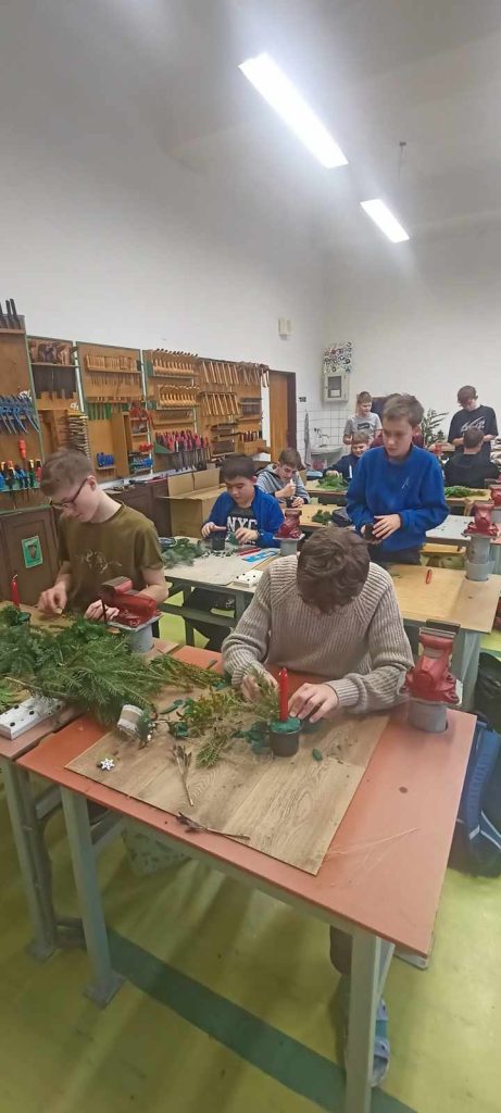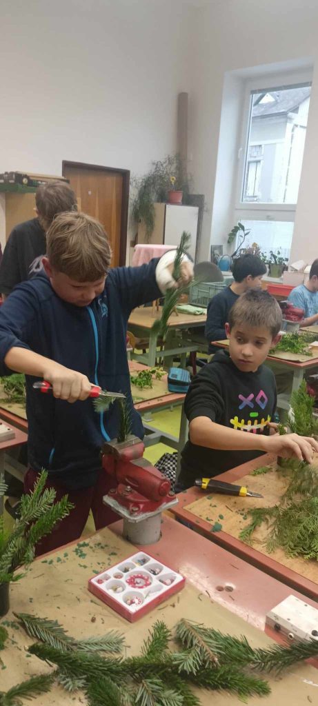 V předvánočním čase jsme si na posledních pěstitelských pracích užili krásné tvoření. Žáci si vlastnoručně vyrobili úžasnou vánoční dekoraci – svícen z větviček jehličnatých stromů, který ozdobili svíčkou a vánočními dekoracemi.